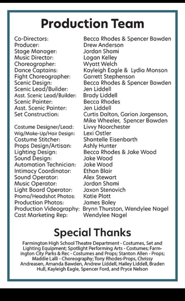 You’re quickly greeted by the most heavenly voice of Chrissy Andreasen playing Marguerite. Her gown is nearly as impressive as her voice, spanning across the stage with an audacity that ensures her image stays with you long after the curtain falls. The illusion of 1792 France comes alive through the cast’s mastery of the score under music director Logan Kelly, the colorful and intricate costumes crafted by Livvy Noorchester, the ever-shifting sets guided by stage manager Jordan Shami, and the expert choreography of Wyatt Welch. What was once a small, humble stage almost magically becomes an entire Parisian street in the middle of the French Revolution– complete, of course, with Madame Guillotine at the center of it all.