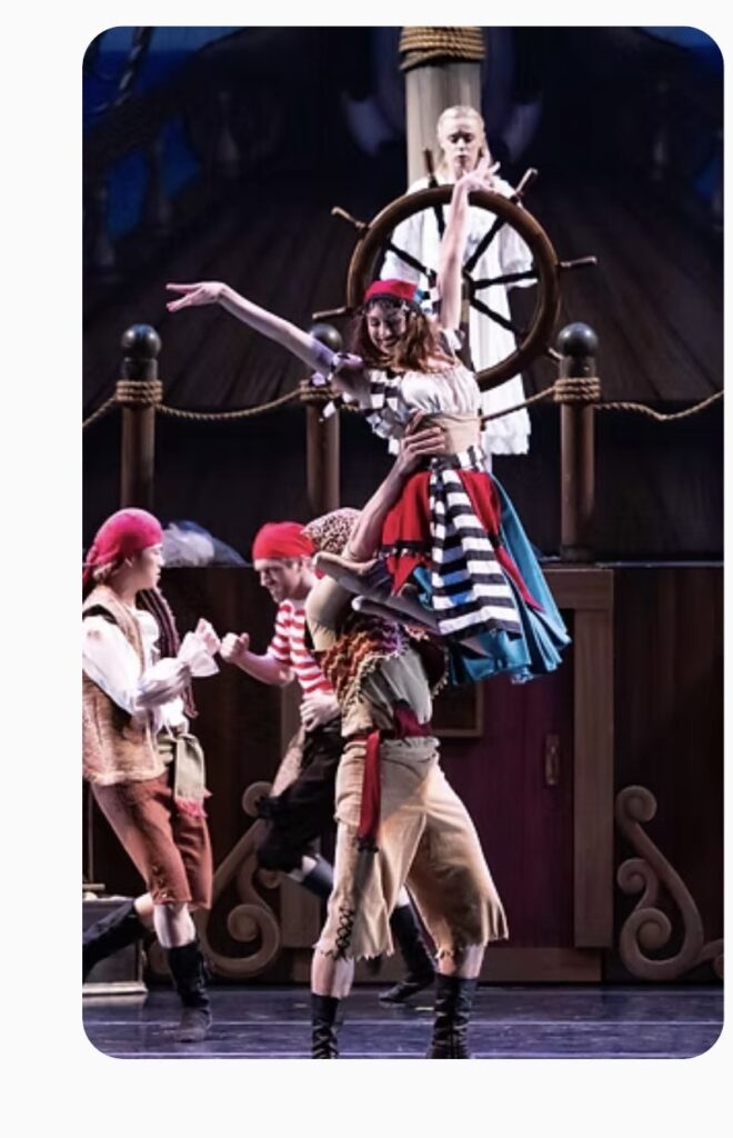 Peter Pan himself is brought to life by Ryan Hatch who literally flies onto the stage. At that moment my youngest saw a celebrity in the flesh, whispering, “Oh my gosh,that is Peter Pan!”. With an impish smile, Hatch not only elevates himself but his performance inspires the whole production. Hatch just looks like he is having fun. Hiding among unsuspecting pirates, swooping around in the air, swinging a sword, interjecting himself into Tiger Lily’s pas de deux until it becomes a pas de trois. Hatch looks so full of happy thoughts that when he performs a grand jete we might have expected him to take off into the air, even without the wire. It is the perfect performance for the carefree boy who never wants to grow up.