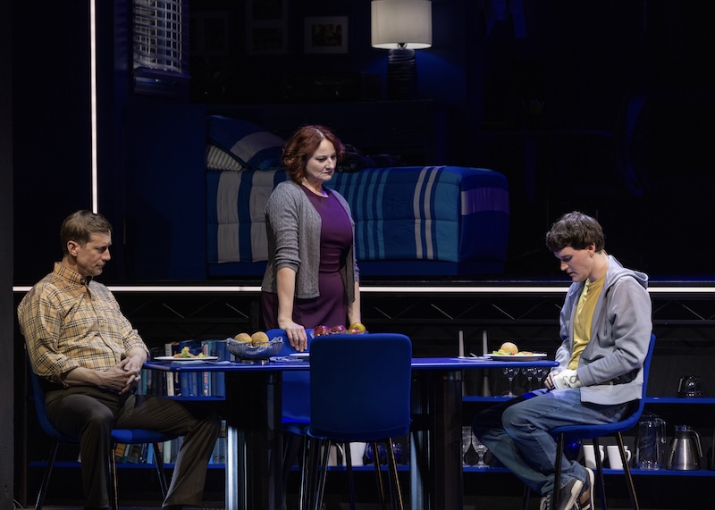 Marika Aubrey (Cynthia Murphy) brings a quiet intensity to the stage, her performance marked by earnestness and a deep feeling of longing. Her portrayal of a mother searching for something good in her son’s troubled life is deeply touching. You understand her hope, her need to find something to hold on to while everything else falls apart. Andrew Samonsky (Larry Murphy) possesses one of the most beautiful voices that is both rich and resonant. His vocal presence adds weight to every scene he’s in, anchoring the family’s turmoil with quiet solidity.