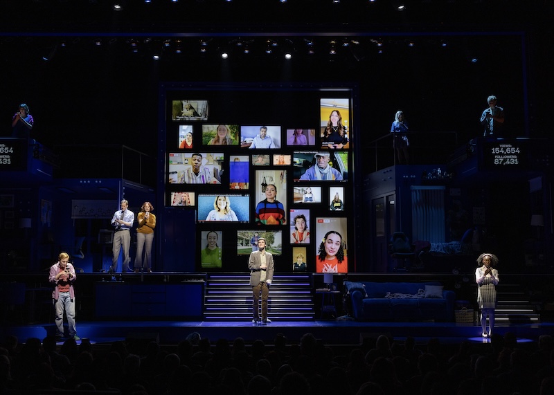 The conflict between silence and sound is ideal for Karen Azenberg’s (Director & Choreographer) direction. She expertly frames isolation. Azenberg allows quiet passages to linger like unread messages. Her choreography focuses more on emotional architecture than dance. She maps out Evan’s inner landscape with gesture and distance. The movements of the group reflect the constant upheaval of the virtual world that both elevates and engulfs Evan. The effect is ruthless and captivating. The glow of the stage light sanctifies Evan. He is utterly alone in the dark. Azenberg’s vision is a razor cutting through the well-manicured, fabricated reality of the online world, laying bare the actual reality where digital deteriorates relationships and flesh-and-blood connections are more substantive and necessary.