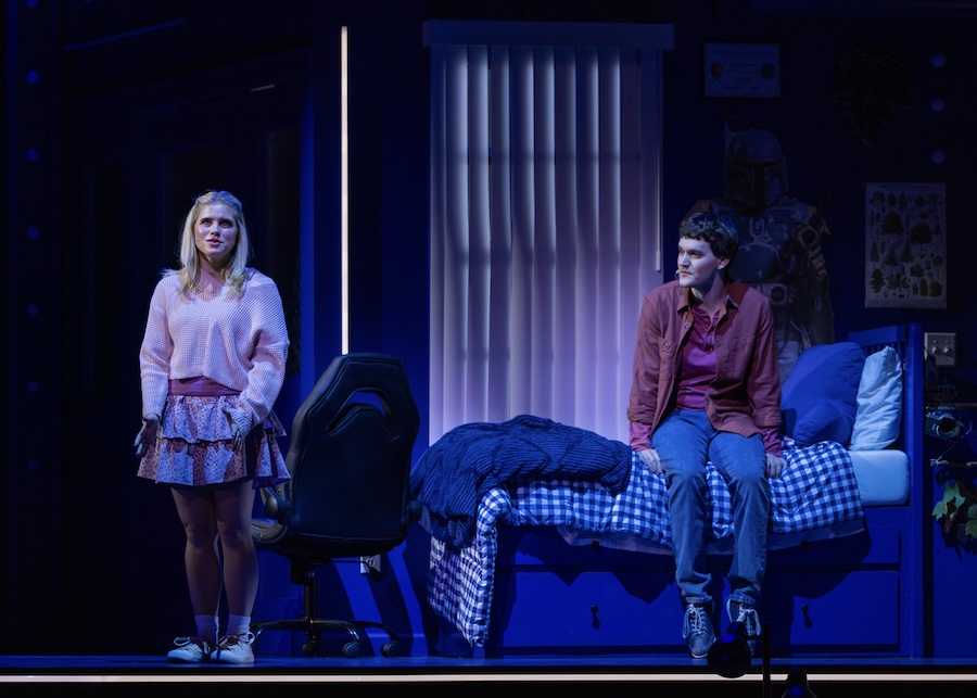 In a role that requires emotional agility, accuracy, and vulnerability, Kyle Dalsimer (Evan Hansen) bears a heavy emotional burden. Evan is a notoriously contradictory and complicated character. Sincere but dishonest, timid but eager to connect. Through expressive physicality, Dalsimer navigates these dualities, capturing Evan’s social anxiety and depression. Before he speaks, his slouched shoulders, darting eyes, and hesitant movements convey a great deal. As you watch him, almost instinctively, wipe his hands on his coat or shirt, you believe his sweaty palms. The visible tics then fade away as he starts to sing songs like “If I Could Tell Her” and “Words Fail,” exposing the inner monologue and the unadulterated strength of a young man who longs to be noticed. The show is anchored with heart and authenticity by this performance, which feels both fierce and fragile.