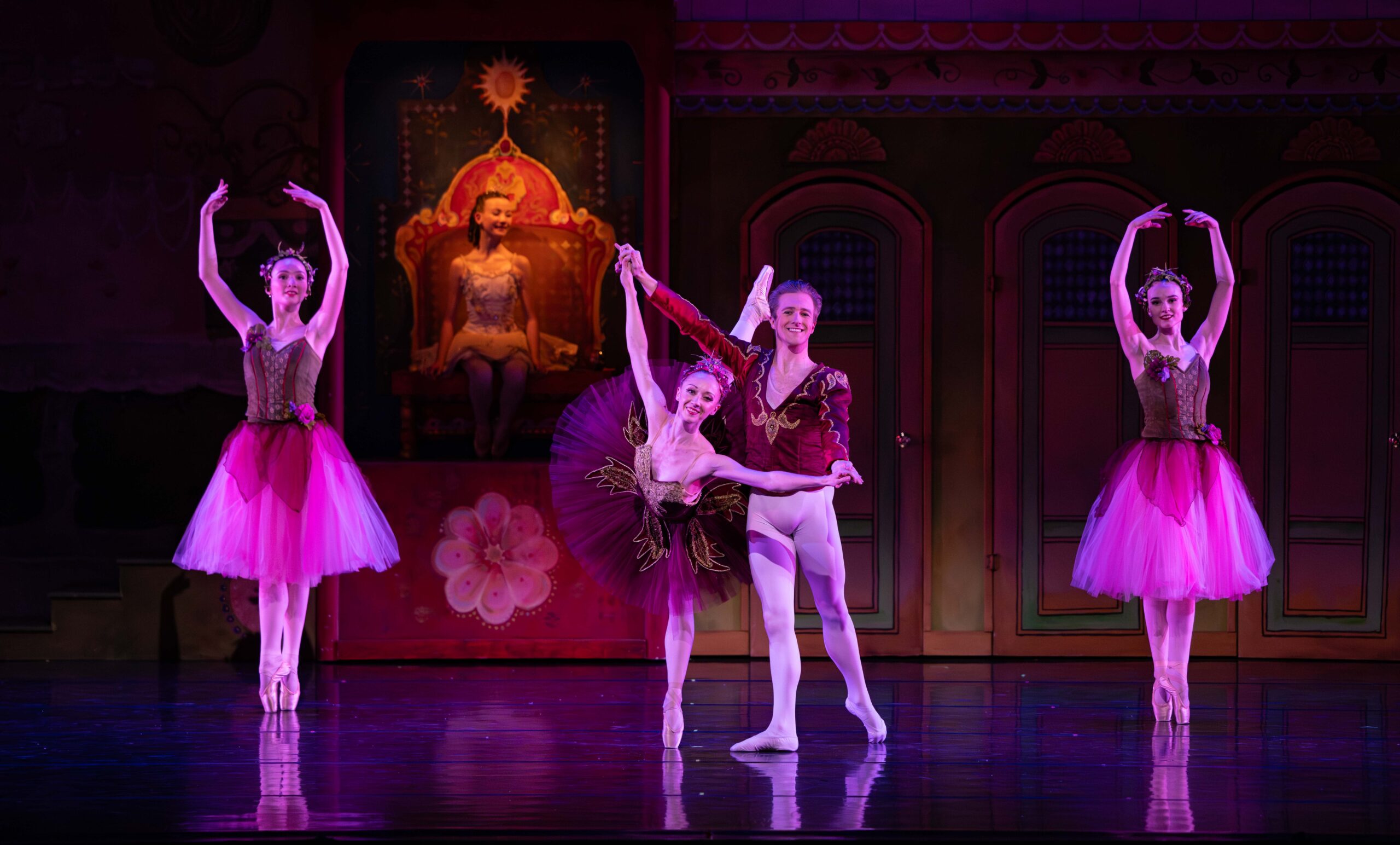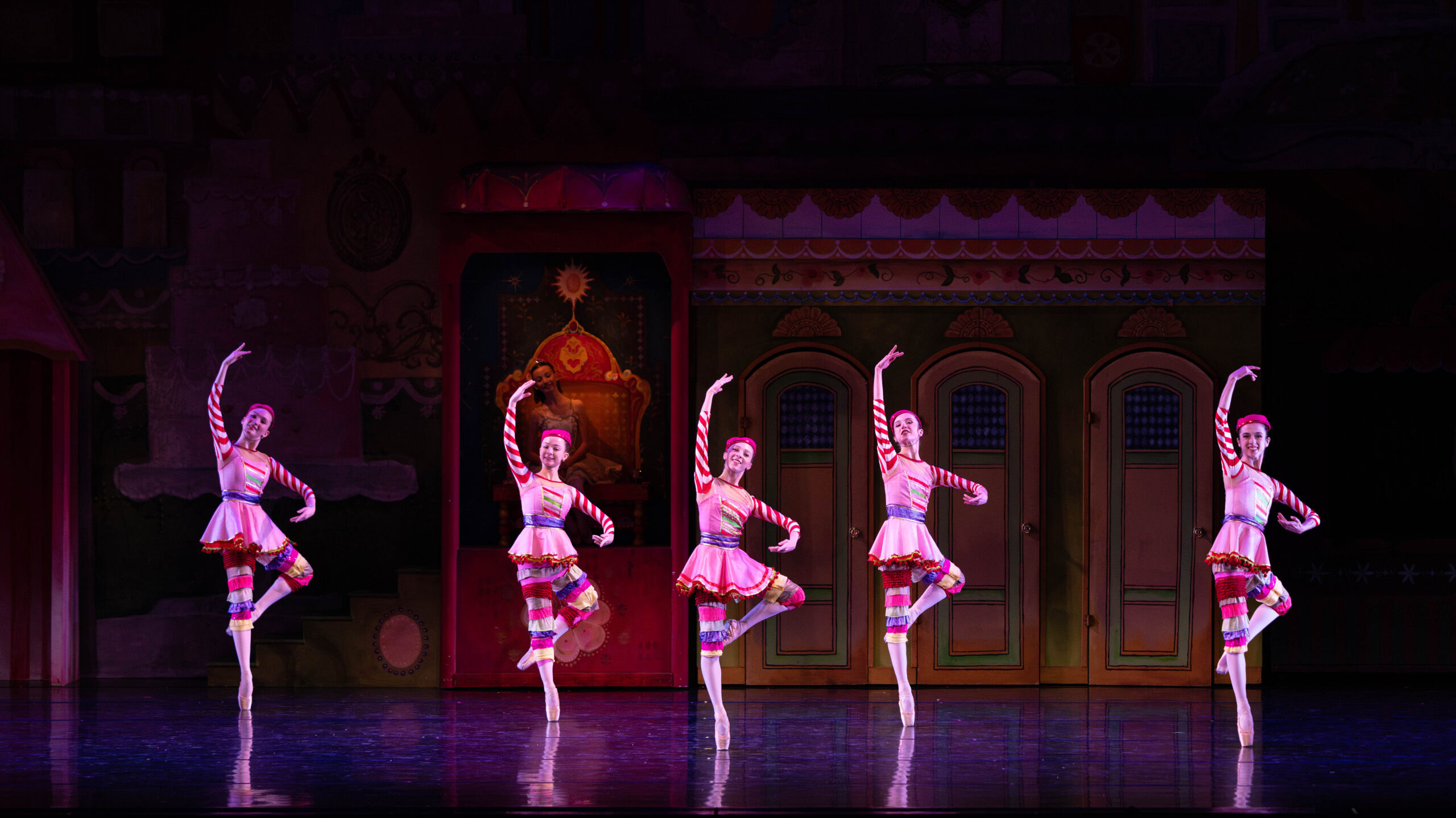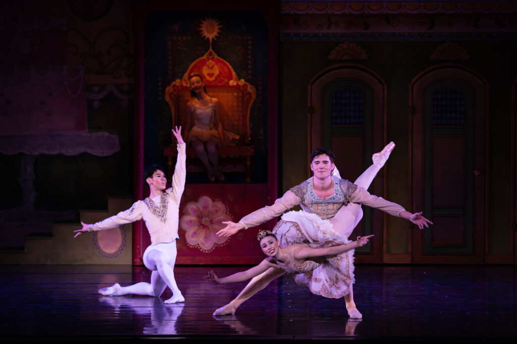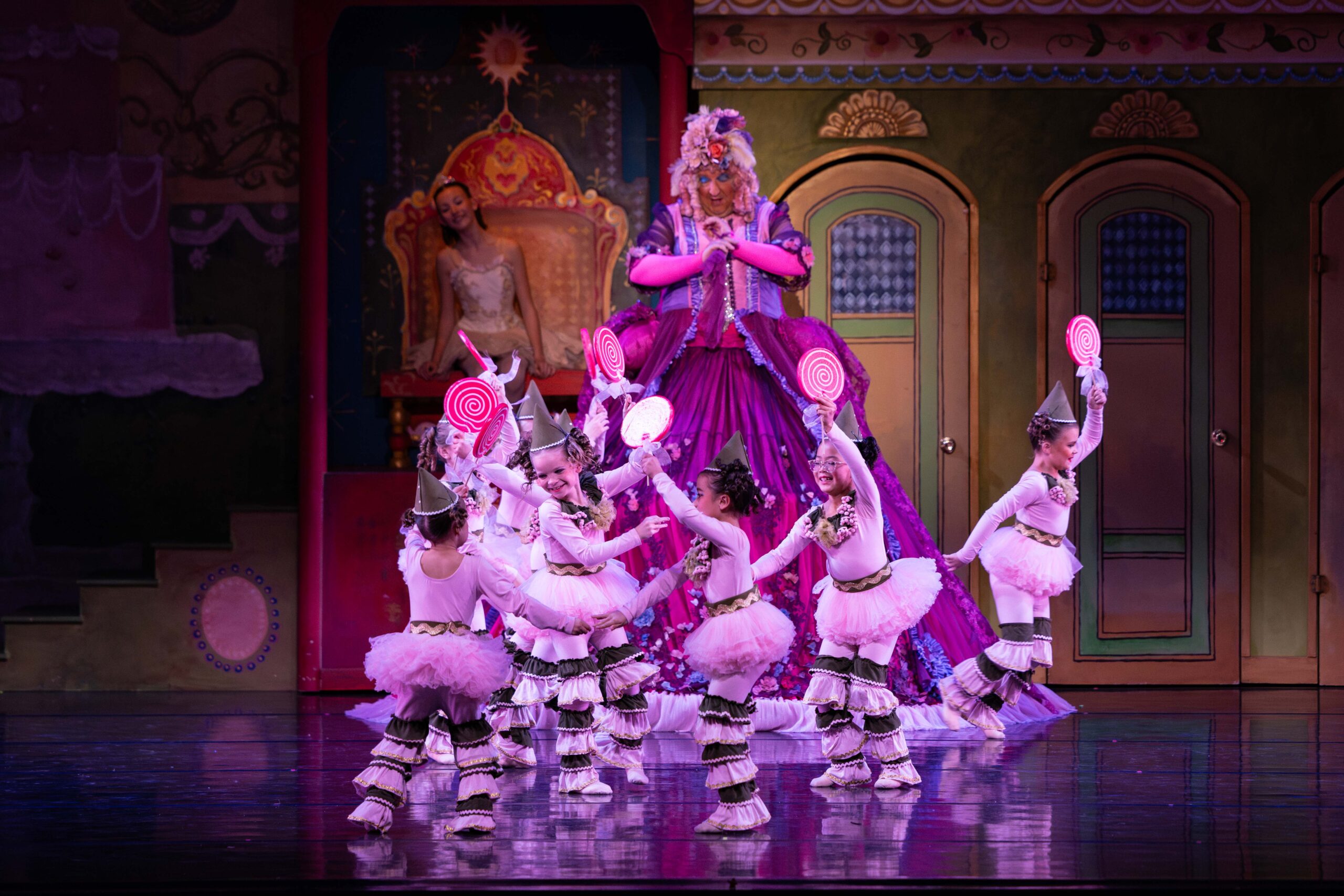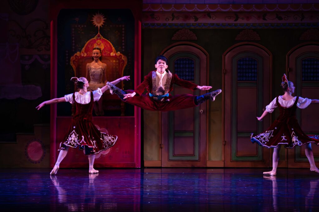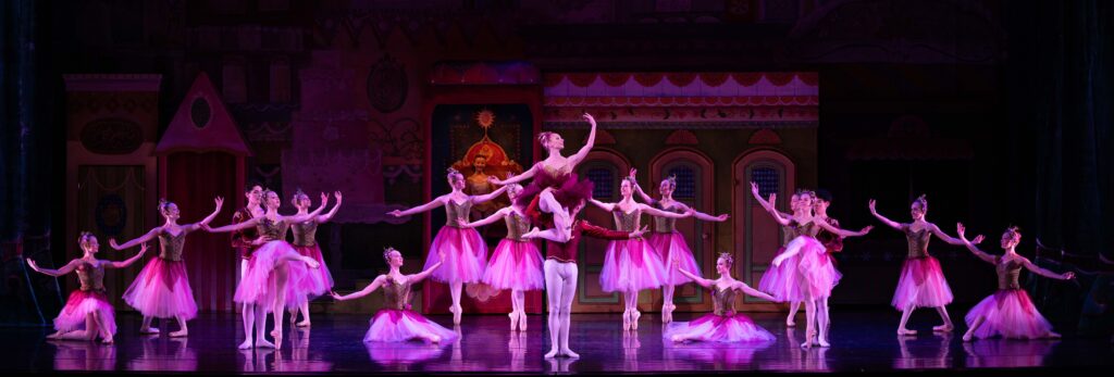 The winter sequence stands out for its cohesion and grace. This cool blue scene is a perfect transition from the warm Christmas party to the lavish world parade in Act II. Sydney Lee as the Snow Queen and Ryan Hatch’s Snow Prince lead the ensemble with poise. Their entrance is grand, their movements crisp and expansive, the Snow Drops glide and float in the fog, setting a tone of quiet majesty that carries the audience into the dreamlike second act.